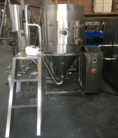 制備出真正的圓球狀實(shí)心微球顆粒,首選實(shí)驗(yàn)可用上海歐蒙生產(chǎn)的OM-5000型實(shí)驗(yàn)型噴霧干燥機(jī)。實(shí)驗(yàn)型噴霧干燥機(jī)系統(tǒng)工作流程如圖所示。該系統(tǒng)的工作原理是空氣經(jīng)過電加熱以后,再通過高溫過濾器,以保證進(jìn)人塔體的空氣是潔凈熱空氣,然后通過干燥室頂部的熱風(fēng)分配器,通過熱風(fēng)分配器的熱空氣均勻地進(jìn)人干燥室內(nèi)并呈螺旋狀轉(zhuǎn)動,同時將料液送至離心噴霧頭。鋁礬土料漿被高速旋轉(zhuǎn)的噴霧頭噴射成球形霧滴,水分迅速在霧滴表面蒸發(fā),在極短的時間內(nèi),霧滴干燥收縮成為微球坯體。較粗的微球顆粒由干燥室底部的收集桶收集,較細(xì)的微球顆粒通過設(shè)在錐底的管道流到旋風(fēng)分離器,并由套在旋風(fēng)分離器底部的收集桶收集。廢氣通過除塵器排出。