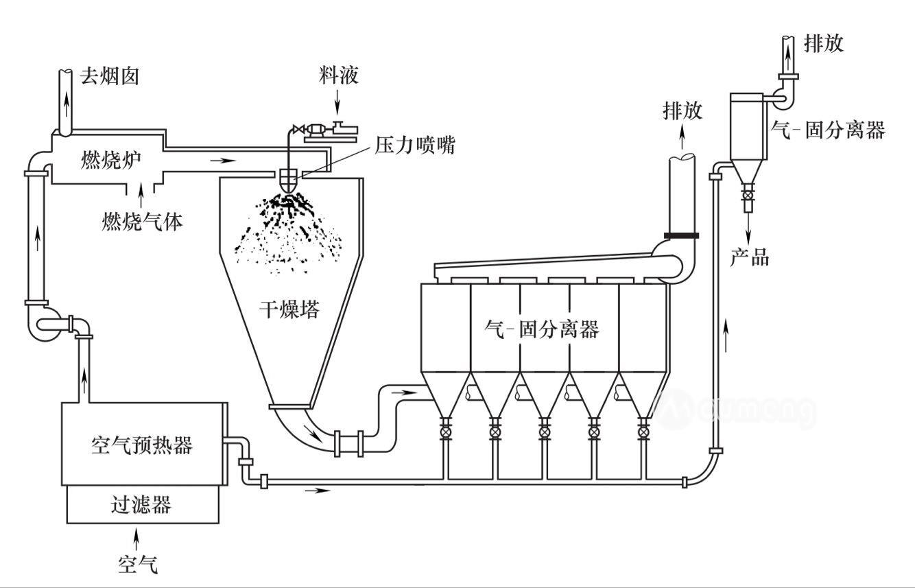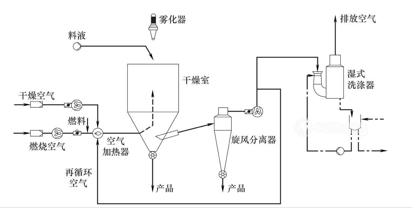 所謂噴霧干燥機(jī)開式循環(huán)流程,就是采用的干燥介質(zhì)是空氣,干燥完成以后,廢氣排放到大氣中。