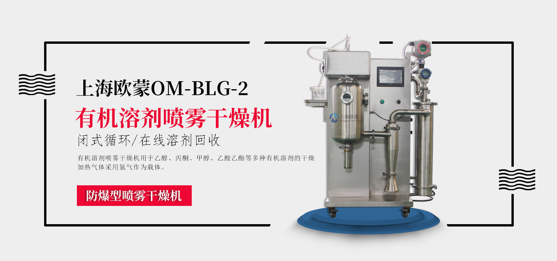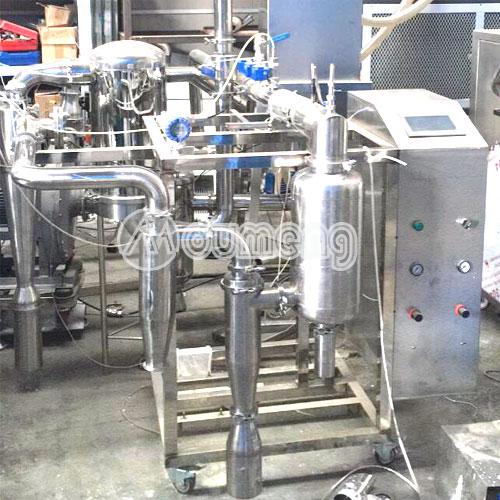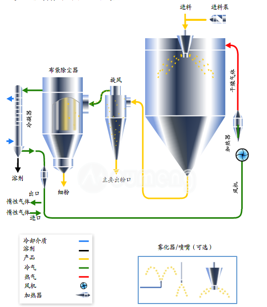 N2氮?dú)庋h(huán)式噴霧干燥機(jī)系統(tǒng)采用密閉設(shè)計(jì),主要應(yīng)用于酒精類溶液,N2作為惰性氣體干燥使得設(shè)備運(yùn)行更加安全。產(chǎn)品無氧化,品質(zhì)好,粉料松裝比重及平均粒徑一致性好,其流動(dòng)性可滿足自動(dòng)壓機(jī)連續(xù)化生產(chǎn),同時(shí)溶劑介質(zhì)可以在線回收。在規(guī)定的條件下溶劑蒸發(fā)能力2Kg/h(根據(jù)物料固體含量)。整套設(shè)備由供料系統(tǒng)、霧化器、電加熱器、干燥塔、旋風(fēng)收塵器、冷凝塔、防爆裝置、在線氧氣檢測系統(tǒng)及電氣控制系統(tǒng)組成等。