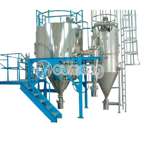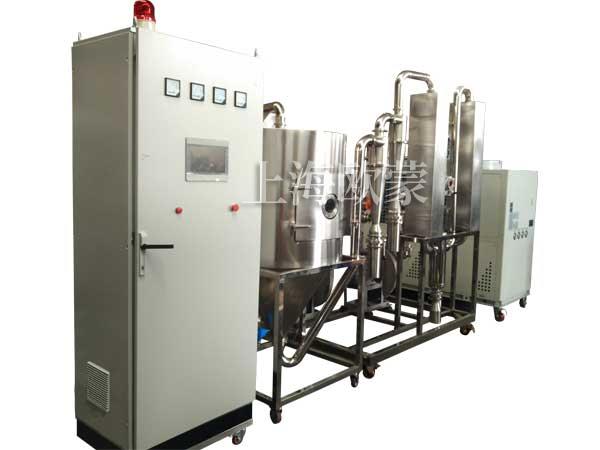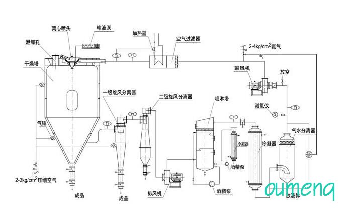 閉式循環(huán)噴霧干燥機(jī)系統(tǒng)由噴霧干燥機(jī)主機(jī)、帶空氣過濾器的加熱器、鼓風(fēng)機(jī)、水氣分離器、大小冷卻塔、噴淋塔、排風(fēng)機(jī)、一級(jí)旋風(fēng)分離器、二級(jí)旋風(fēng)分離器、泵、測(cè)氧儀以及管路與控制閥等組成。